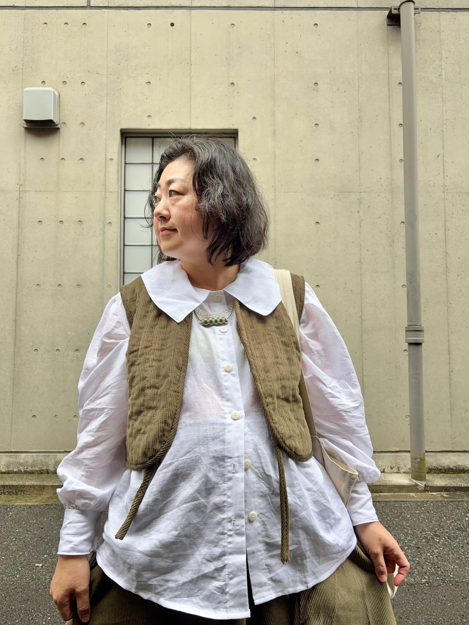 The Holly Blouse is a dramatic style with a whimsical collar, a drop shoulder for a blousier sleeve. Perfect on its own or worn under our Heather Quilted Vest for a cozy professorial vibe.