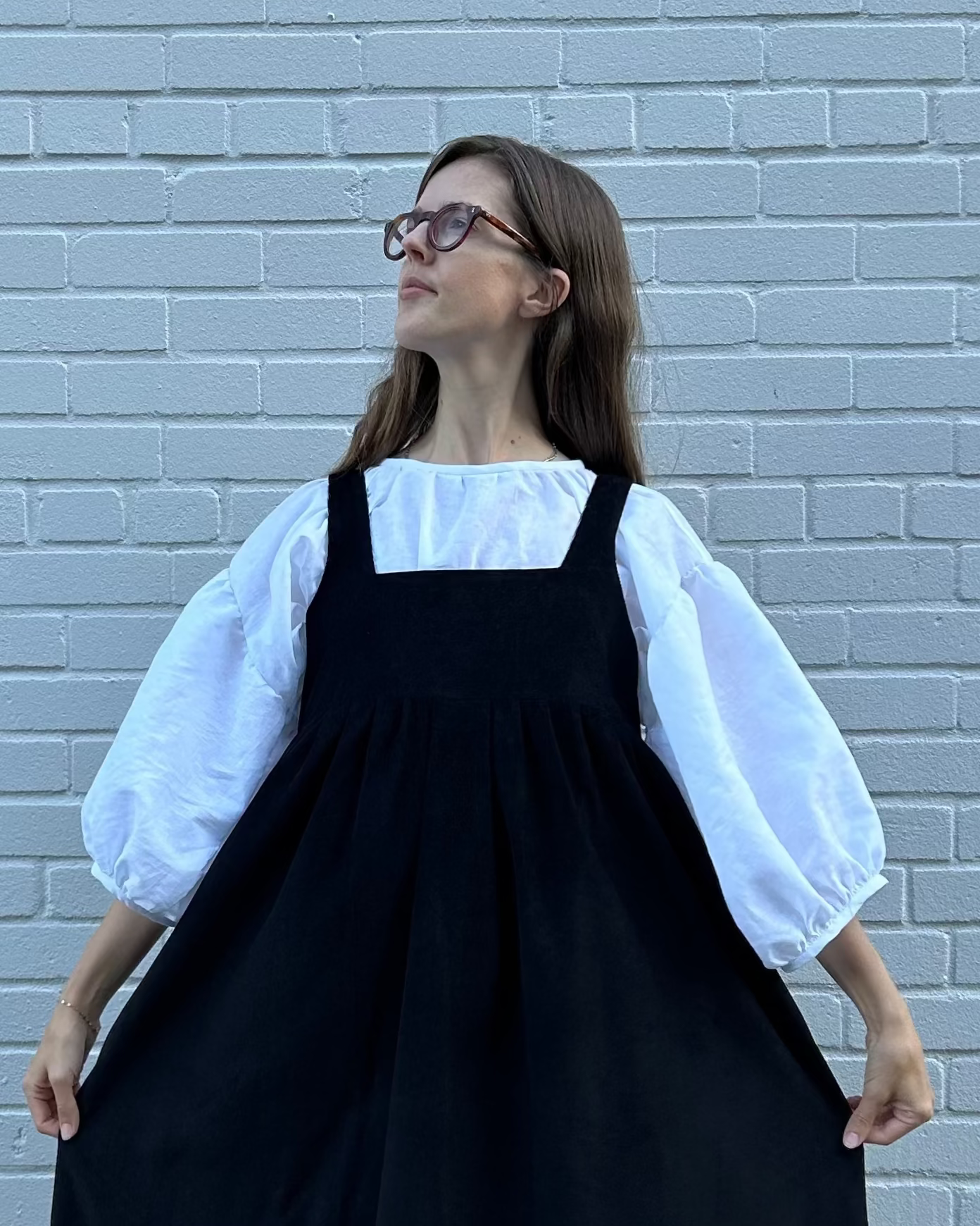Our bestselling the Lucinda Blouse is loose fitting with dramatic puff sleeves. It's comfy and breezy, and pairs well with our Rana Jumper, our Heather Skirt or Pants. Our Lucinda Blouse comes in classic lightweight Japanese lawn with a fine floral pattern, either in navy or cream (also 100% cotton), or white handkerchief linen.